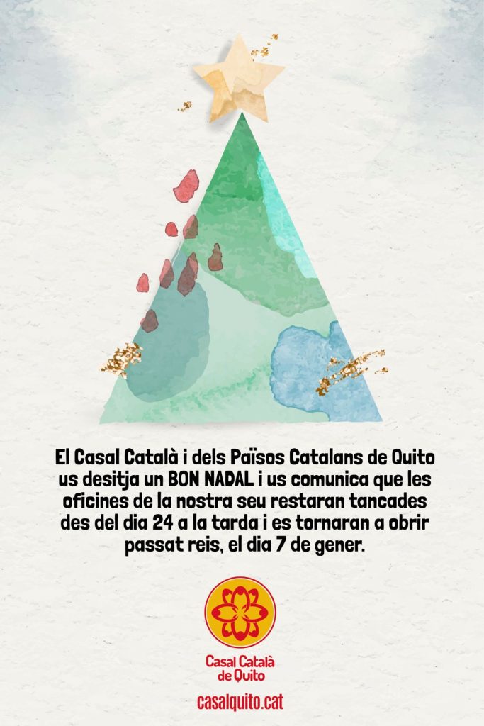 El Casal Català i dels Països Catalans de Quito us desitja un BON NADAL i us comunica que les oficines de la nostra seu estaran tancades des del dia 24 a la tarda i es tornaran a obrir passat reis, el dia 7 de gener de 2026.