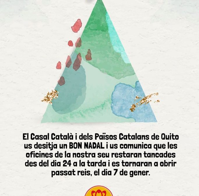 El Casal Català i dels Països Catalans de Quito us desitja un BON NADAL i us comunica que les oficines de la nostra seu estaran tancades des del dia 24 a la tarda i es tornaran a obrir passat reis, el dia 7 de gener de 2026.